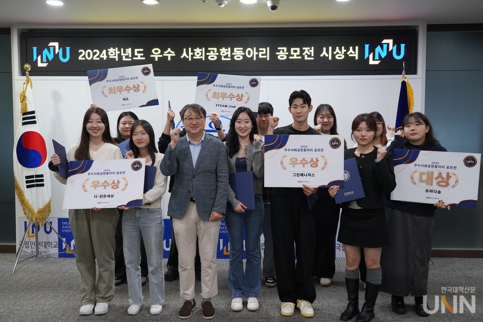 [한국대학신문 이정환 기자] 인천대학교(총장 박종태)는 재학생들이 지식 및 재능 나눔을 통해 지역사회 공헌에 이바지하고 창의적이고 혁신적인 사고로 변화와 혁신을 주도할 수 있도록 고취하고자 ‘인천대학교 우수사회공헌 동아리 공모전’을 진행하고 지난 18일 시상식을 가졌다.