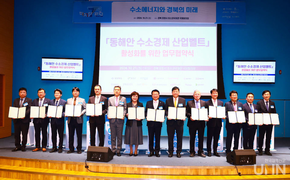 [한국대학신문 이정환 기자] 서울대학교(총장 유홍림)는 지난 21일 포항 포스코 국제관에서 개최된 ‘동해안 수소경제 포럼’에서 경상북도(이철우), 포항시(이강덕), 울진군(손병복), 삼성물산(오세철), 테크로스 워터앤에너지(윤혁노), HD현대플라스포(이헌준), 포항공과대학교(김성근), 경북대학교(서창교), 경일대학교(정현태), 동국대학교 WISE캠퍼스(류완하), 영남대학교(최외출), 한동대학교(최도성), 한국산업기술시험원(이일수) 등과 함께 ‘동해안 수소경제 산업벨트 활성화를 위한 업무협약’을 체결했다.