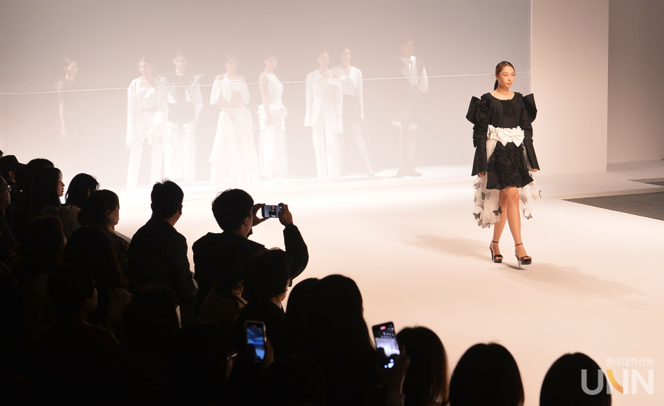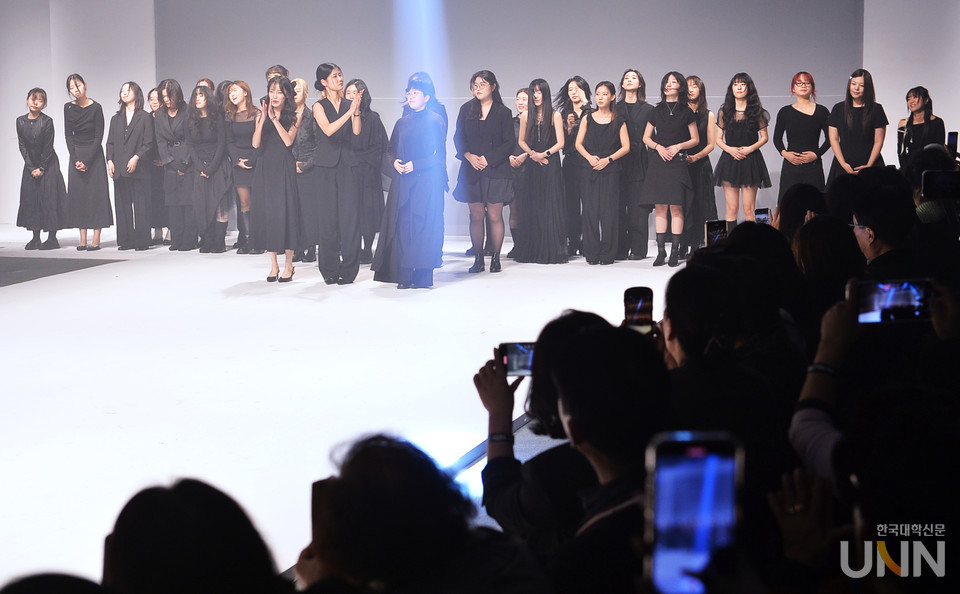 패션쇼 피날레에서 이 날 작품을 낸 33명의 학생들이 무대 워킹 후 관객을 향해 인사하고 있다.(맨 아래)
