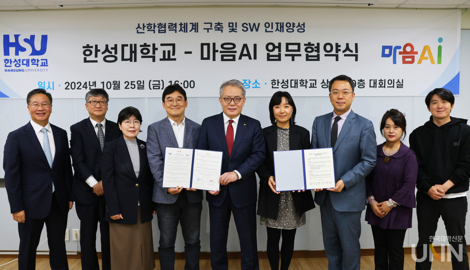[한국대학신문 이정환 기자] 한성대학교(총장 이창원)는 지난 25일 교내 상상관 9층 대회의실에서 ㈜마음AI와 SW·AI 분야 인재양성 및 산학협력을 위한 업무협약을 체결했다고 밝혔다.