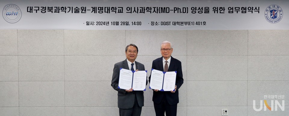 [한국대학신문 이정환 기자] DGIST(총장 이건우)와 계명대학교(총장 신일희)가 미래 의료 혁신을 주도할 차세대 의사과학자(MD-Ph.D) 양성에 나선다.