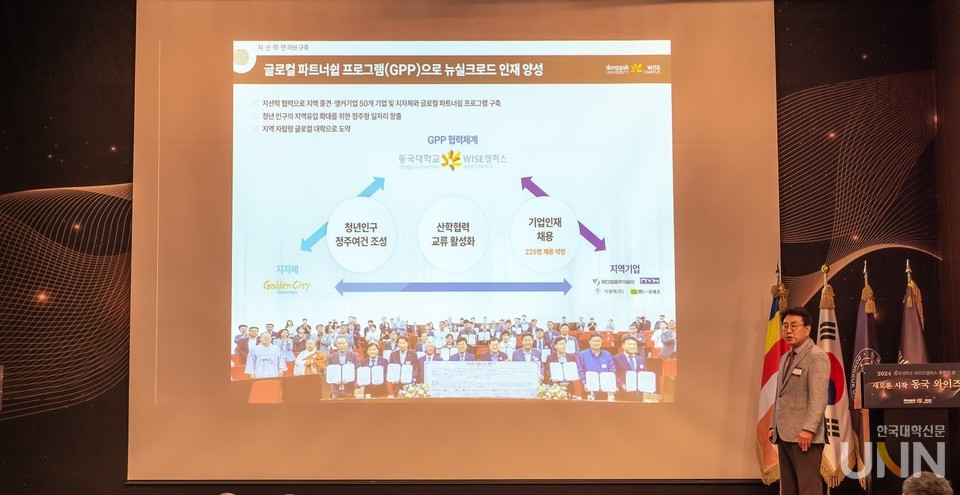 류완하 동국대 WISE캠퍼스 총장은 대학의 미래 비전에 대해 약 10분 간 직접 발표하며 “동국대 WISE캠퍼스는 미래 비전을 선도하는 글로컬 인재 양성을 위해 지역의 정체성을 반영한 역사 문화 관광과 첨단 에너지 방향으로 교육과정을 특성화하고 있다”며, “기부자님들의 소중한 정재가 모여 교육 혁신 인프라를 조성하고 글로컬 인재를 키워 건학이념을 구현할수 있도록 최선의 노력을 다하겠다”고 말했다.