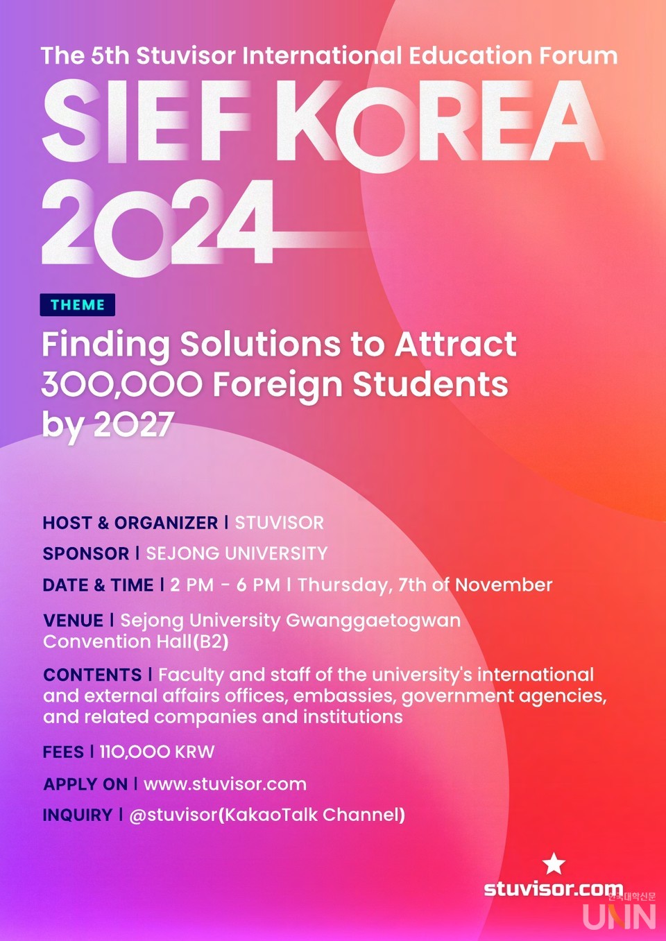 세종대가 공식 후원하는 제5회 스튜바이저 국제교육포럼에는 전국 대학 국제처, 대외처, 국제교육원, 한국어교육원, 대사관 등 관련 기관 및 기업의 전문가들이 참석할 예정이다. 세종대의 초청을 받은 참가자는 스튜바이저 공식 홈페이지를 통해 무료로 등록할 수 있다.