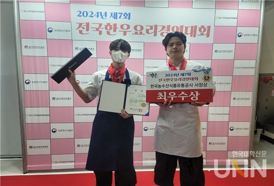 [한국대학신문 이정환 기자] 대구공업대학교(총장 이별나) 호텔외식조리계열 이종서(2학년),권태현(1학년) 학생이 지난 1일 양재동 aT 센터 제 2전시장에서 열린 제7회 전국 한우 요리 경연대회에서 최우수상을 수상했다.