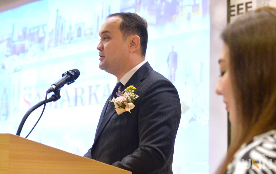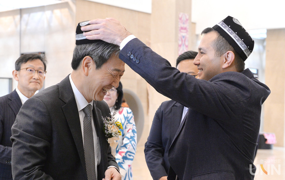 우즈베키스탄 관계자가 정승렬 총장에게 전통 모자를 씌워주고 있다.(맨 위) 개회식에서 인사말을 하고 있는 마카모프 TUIT총장.(두번째)
