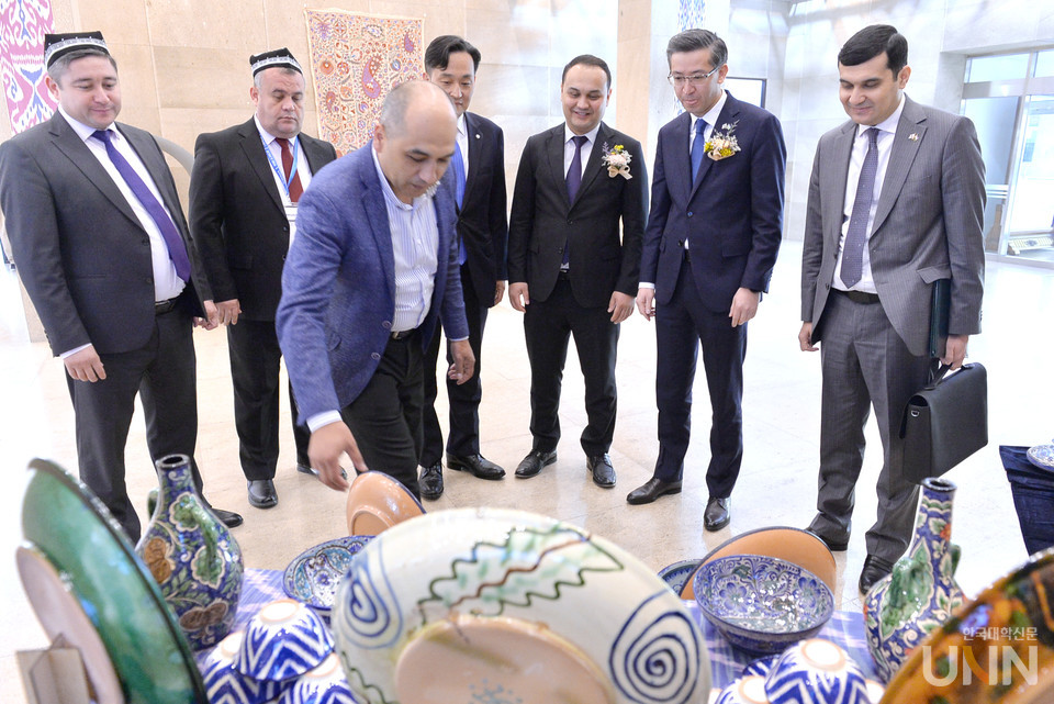 알리셰르 압두살로모프 주한 우즈베키스탄 대사, 마카모프 TUIT 총장, 김병준 국민대 글로벌사업단장(네번째 사진 왼쪽 두번째부터) 등 양국 관계자들이 우즈베키스탄 전통 의상과 도자기 등 전시품을 둘러보고 있다. 전통악기 연주에 맞춰 춤을 추고 있는 우즈베키스탄 방문단.(맨 아래)