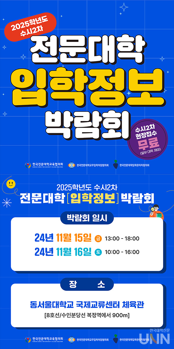 [한국대학신문 이정환 기자] ‘2025학년도 수시2차 전문대학 입학정보 박람회’가 오는 15일(금), 16일(토) 양일간 동서울대학교 국제교류센터 체육관에서 개최된다.
