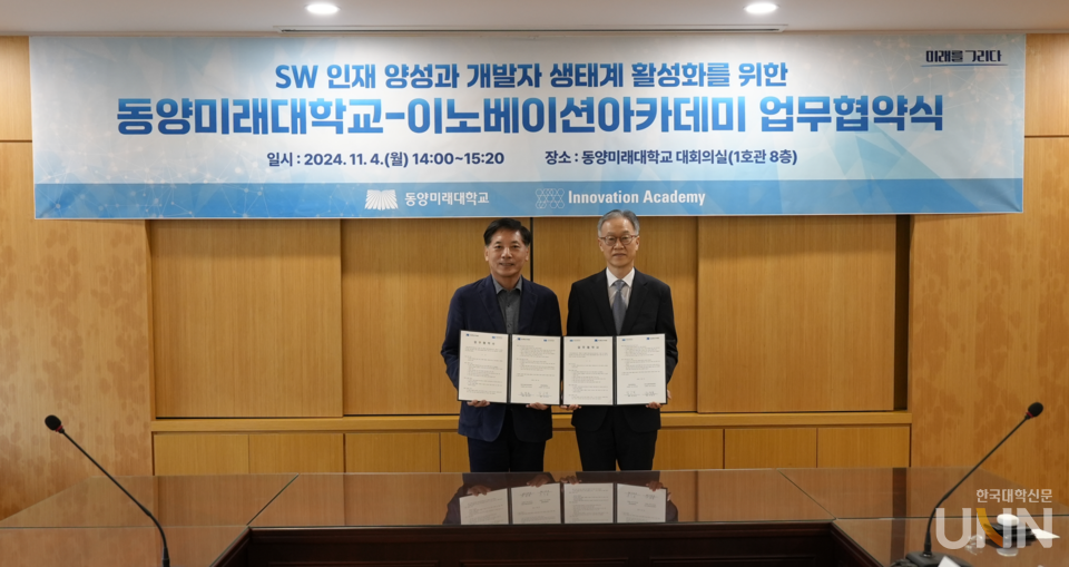 [한국대학신문 이정환 기자] 동양미래대학교(총장 김교일)가 지난 4일 이노베이션아카데미(학장 전영표)와 소프트웨어 인재 양성과 개발자 생태계 활성화를 목표로 업무협약을 체결했다고 밝혔다.