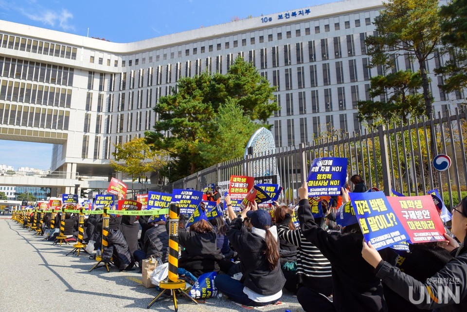 [한국대학신문 이정환 기자] 대구사이버대(총장 이근용)와 원광디지털대(총장 김윤철) 언어치료학과 학생 및 졸업생, 총학생회와 교직원 등은 13일 세종특별자치시 보건복지부 청사 앞에서 호소 집회를 갖고 언어재활사 국가시험 응시 자격 박탈에 대한 해결책을 촉구했다.