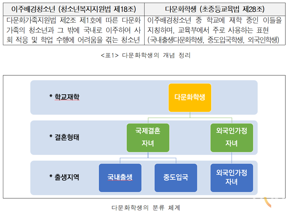 이 글의 한 가지 제한점은 교육부가 지정한 다문화학생 통계와 정책에 따라 수립되는 정책은 초·중·고등학교에 재학하는 다문화학생으로 범위가 제한되기 때문에, 학교 밖 다문화 청소년과 후기 다문화 청소년(19~24세)에 관련된 내용은 제한적일 수밖에 없다는 점을 미리 밝힌다.