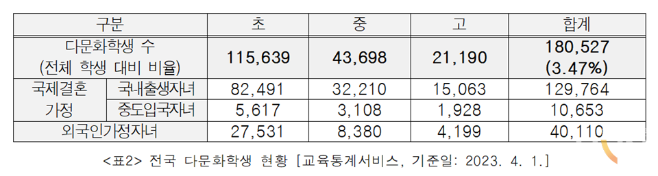 전국 다문화학생 수 18만 명, 전체 학생 수 대비 다문화학생 수의 비율은 3.5%에 이르고 있다. 최근 들어 언론과 미디어에서 자주 언급되는 ‘다문화사회’로의 진입을 앞둔 현시점에, 많은 지역과 학교는 평균보다 훨씬 높은 비율의 다문화학생들이 학교에서 생활하고 있으며, 이에 따른 현장의 학교와 교원들은 교육의 어려움을 호소하고 있다. 각 시도교육청이나 정부의 각 관계 기관에서는 지금까지 10년 이상 다문화학생에 대한 정책을 수립하고 시행해 왔으며 소기의 성과를 보이기도 했지만 급변하는 다문화교육의 정책 수요에 즉각 대응하지 못하고 한발 늦게 뒤를 따라가고 있는 느낌을 현장에서 받는 것은 사실이다.