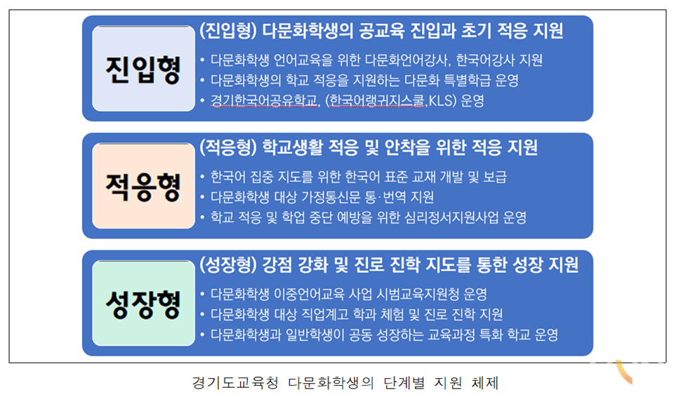 이에 가장 많은 다문화학생이 재학 중인 경기도교육청 다문화교육 정책을 예로 살펴보면, 다문화학생들의 다양한 이주 배경과 특성, 지역의 실태를 반영한 세분된 정책을 추진하고자 다문화학생의 공교육 전입 시기와 학습 단계를 고려한 진입형, 적응형, 성장형 다문화교육 정책을 구안해 효율적 지원이 이뤄지도록 정책을 새롭게 구안하고 있다.
