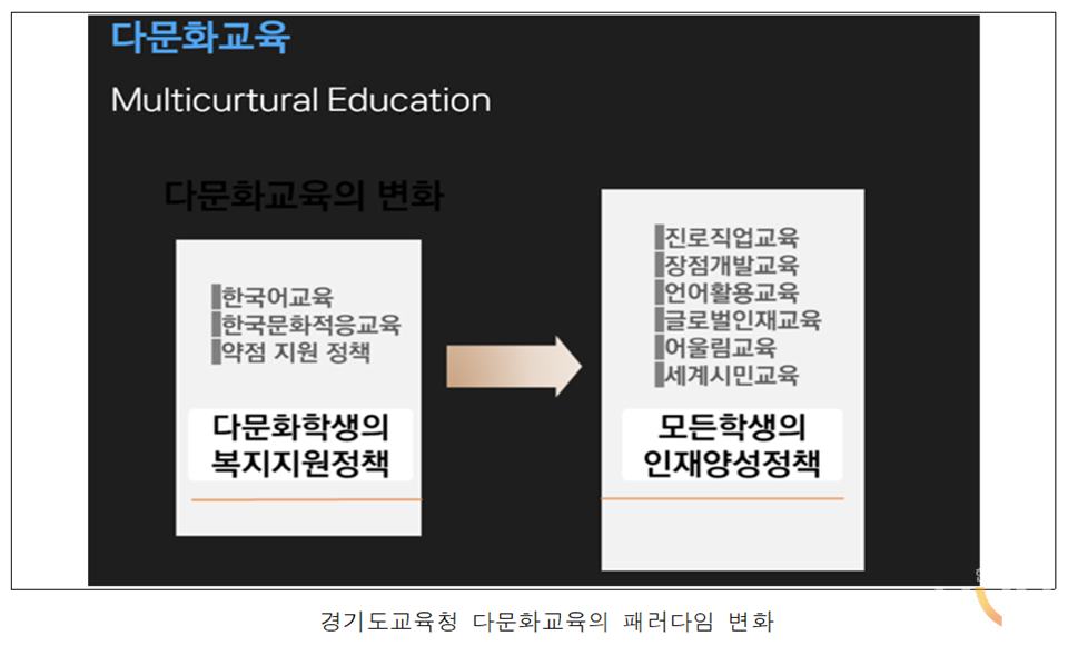 둘째, 교육부의 다문화교육 정책 패러다임의 변화로 가장 의미 있는 부분은 다문화학생의 강점을 강화해 성장에 초점을 맞춘 부분이다. 필자 역시 현장에서 많이 느끼고 경험했던 바이며 지금까지 가지고 있는 다문화학생에 대한 선입견을 벗어나는 정책을 수립하는 데 많은 영향을 줬다. 이와 비슷한 맥락으로 경기도교육청은 다문화교육을 복지 차원의 교육 정책에서 벗어나 장점 개발 교육 정책으로 우선순위를 바꾸고 있으며, 장점을 개발한 성공 사례를 통해 다문화학생들의 진로 및 진학 동기의 강화가 강하게 이뤄지도록 정책 방향을 수립하고자 했다. 이는 더 이상 다문화학생들이 선별적 복지 차원의 시혜 대상이 아닌 보편적 복지의 동등한 교육의 대상으로 인식 전환을 가져올 필요가 있다는 것이다.
