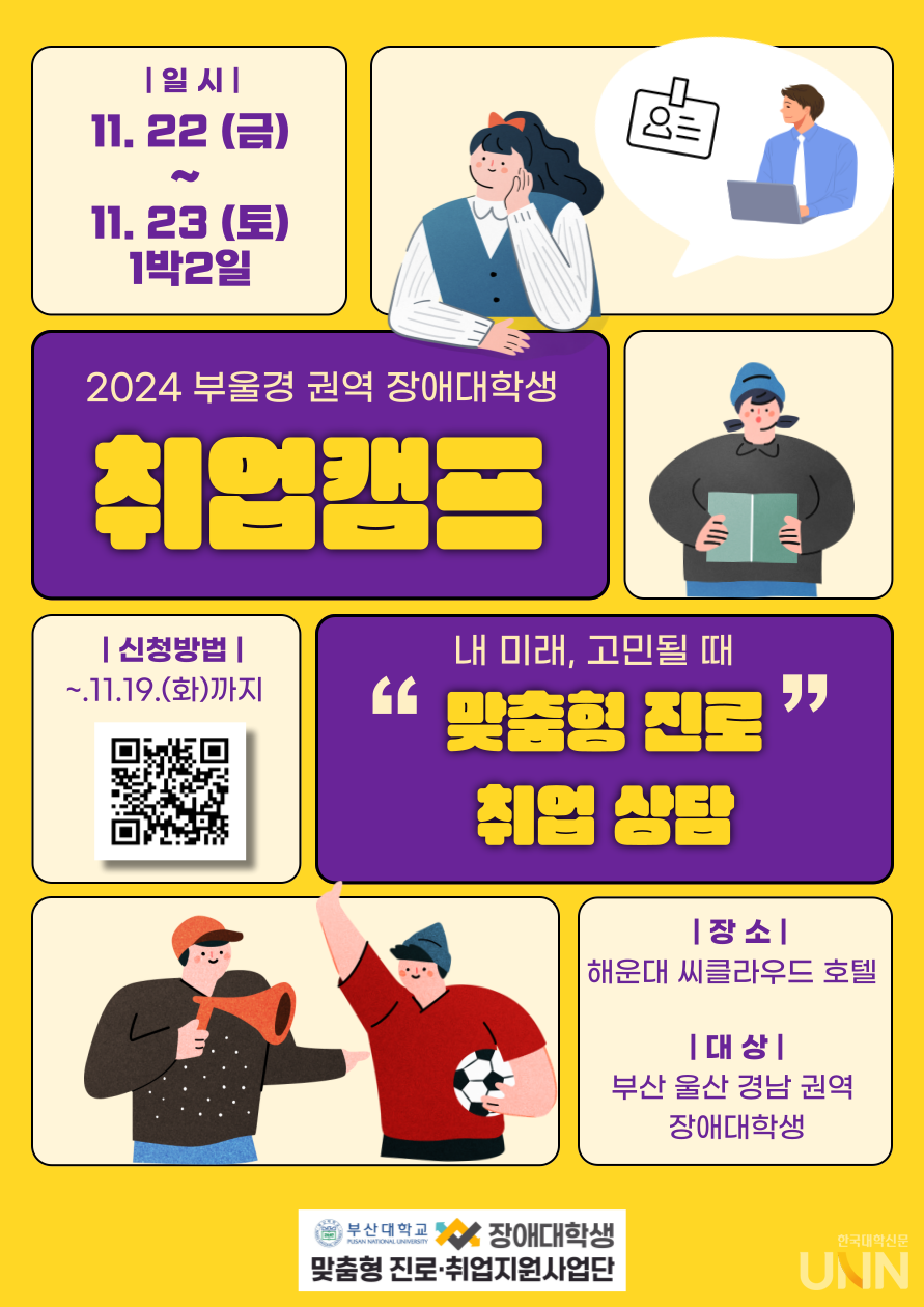 [한국대학신문 이정환 기자] 부산대학교(총장 최재원) 장애학생지원센터는 장애대학생 취업역량 강화를 위한 ‘2024 부울경권역 장애대학생 취업캠프’를 22일부터 23일까지 1박 2일간 부산 해운대 씨클라우드 호텔에서 행사를 개최한다고 15일 밝혔다.