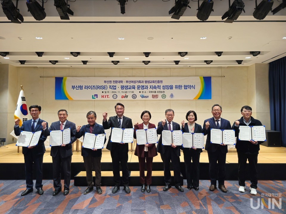 [한국대학신문 이정환 기자] 한국전문대학교육협의회장이자 부산권 전문대학 총장 회장인 김영도 동의과학대학교 총장은 지난 15일 국제식품 초원농원에서 부산권 전문대학 8개교(경남정보대학교 대동대학교, 동의과학대학교, 부산경상대학교, 부산과학기술대학교, 부산보건대학교, 부산여자대학교, 부산예술대학교)와 부산여성가족과 평생교육진흥원 간‘부산형 라이즈(RISE) 직업·평생교육 운영과 지속적 성장을 위한 협약’을 체결했다고 20일 밝혔다.