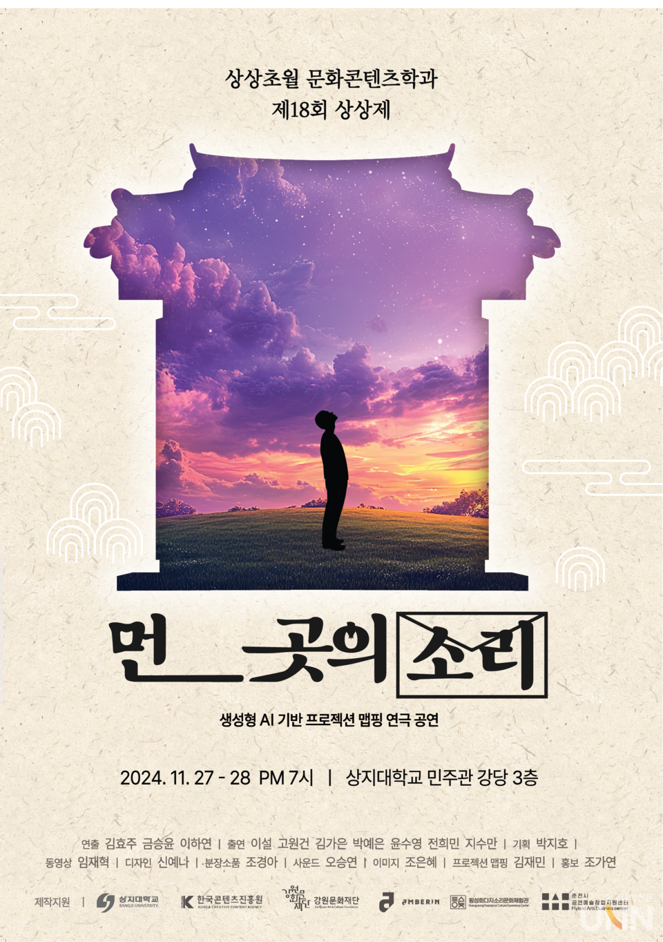 [한국대학신문 이정환 기자] 상지대 문화콘텐츠학과(학과장 홍성태)는 27일과 28일 민주관 3층 강당에서 생성형 인공지능(AI) 기반 프로젝션 맵핑 연극 ‘먼 곳의 소리’를 선보인다.