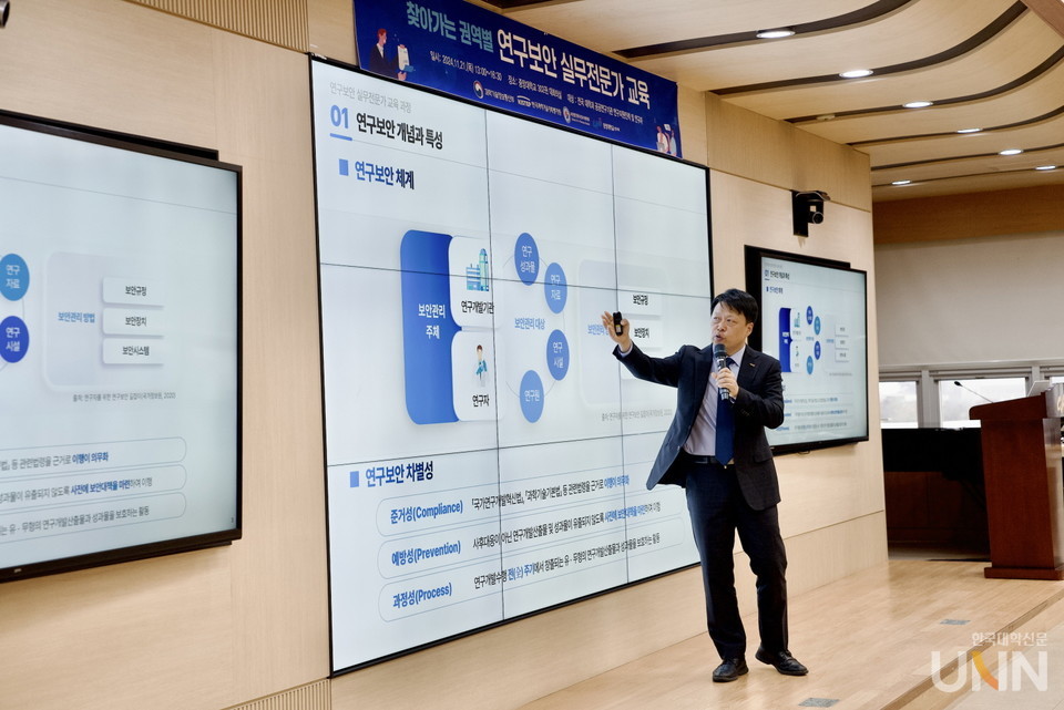 이날 연구보안제도와 보안관리 방법에 대해 강의한 장항배 중앙대 연구처장 겸 한국전자거래학회장은 “개방과 혁신이 중요한 연구현장에서 여전히 연구보안에 대한 인식은 부족한 상황”이라며, “이번 교육을 통해 연구보안 위협에 선제적으로 대응하고 과학기술 경쟁력과 국가 안보를 동시에 강화하는 계기를 마련하길 바란다”고 했다. 이어 “중앙대는 2021년 국내 대학 최초로 연구보안 교육을 대학원 필수과목으로 지정했다. 국내외 연구보안 전문가, 기관들과 협력해 연구성과를 실제 교육과정에 반영함으로써 연구보안 선도대학으로서의 역할을 지속적으로 수행하겠다”고 강조했다.