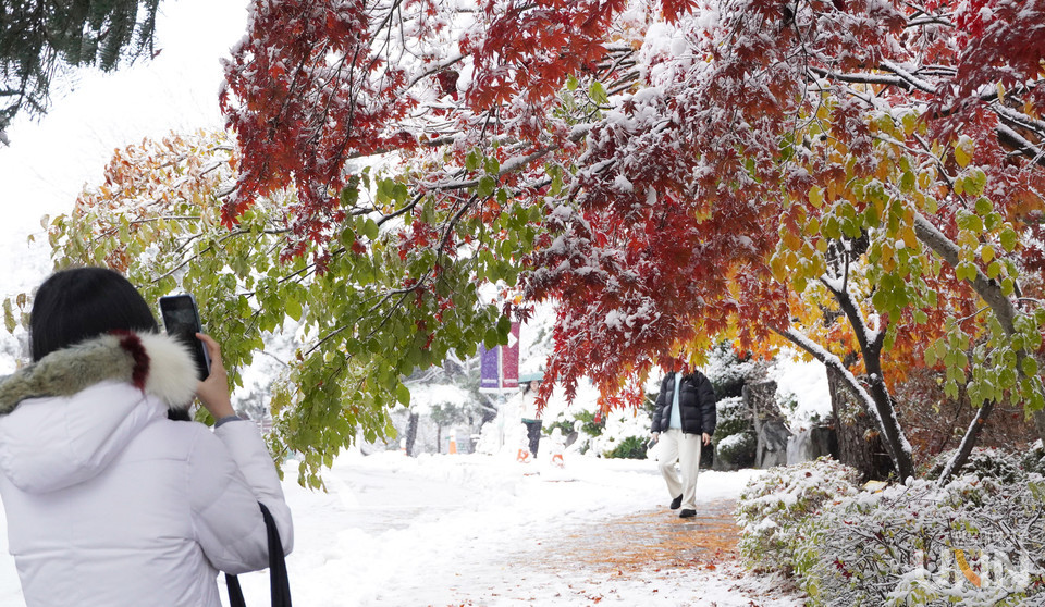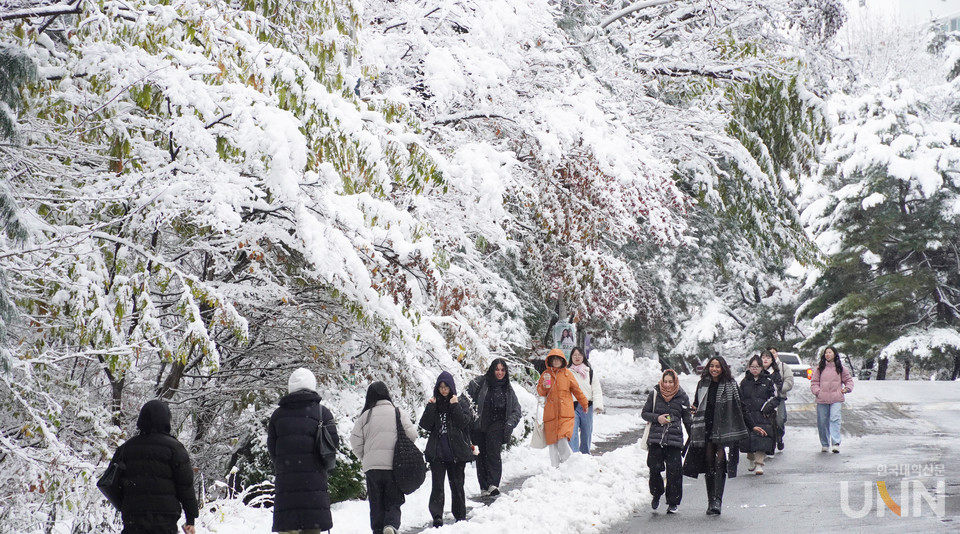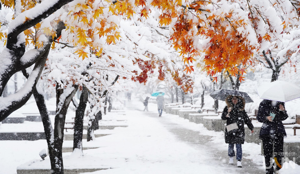 첫 눈이 소복이 내린 캠퍼스의 미처 나뭇잎을 떨구지 못한 단풍은 하얀 눈을 고스란히 품어 안았다. 나무들도 가지를 늘어뜨리고 학생들을 맞는다.