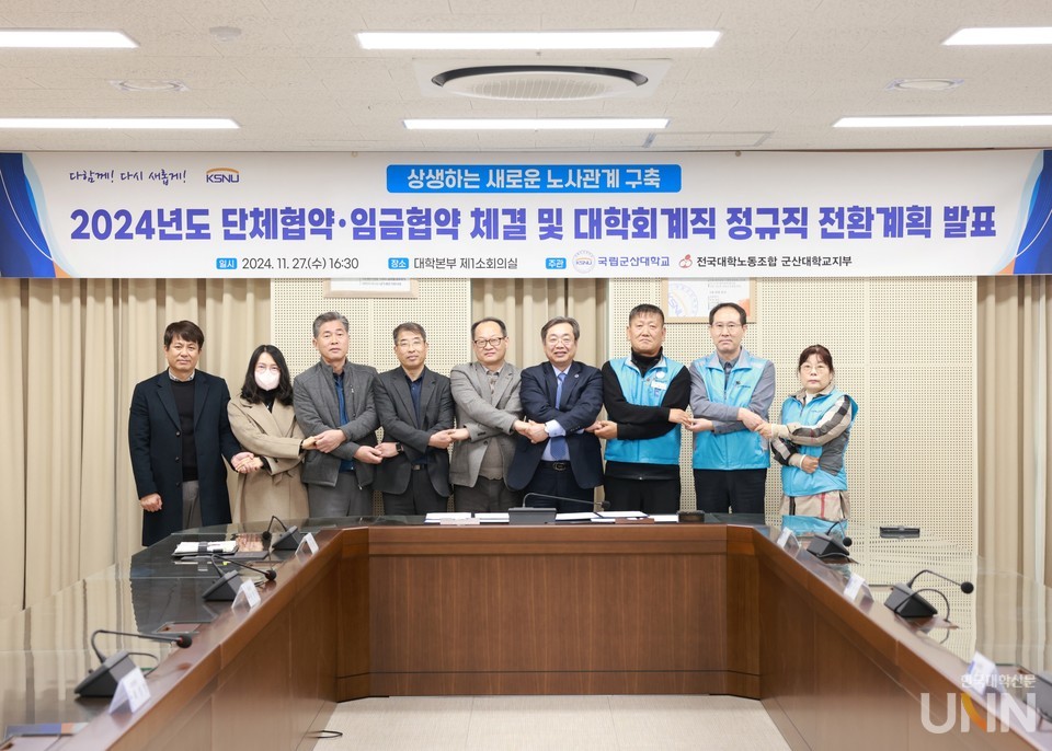 27일, 국립군산대는 대학 본부에서 열린 ‘노사 임금단체협약 조인 및 정규직 전환 계획 발표’에서 대학과 노사가 합의한 가운데 정규직 전환을 위한 본격적인 작업에 돌입했다.