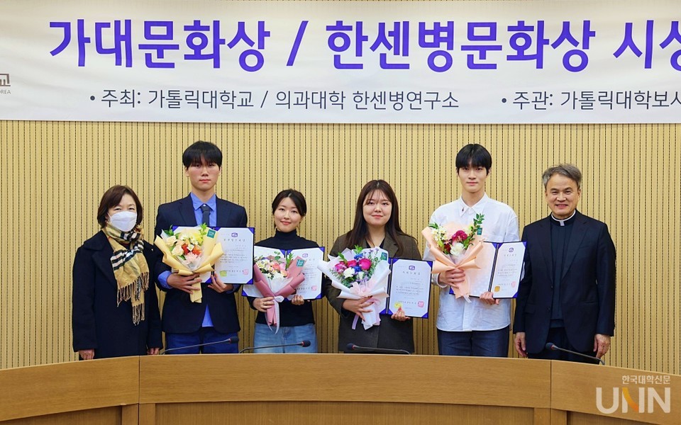 [한국대학신문 이정환 기자] 가톨릭대학교(총장 원종철)가 ‘제45회 가대문화상’과 ‘제16회 한센병문화상’ 시상식을 동시 개최했다. ‘가대문화상’은 가톨릭대학보사가 매년 주최·주관하는 문학·예술 공모전으로 1980년 성심문학상으로 시작해 올해 45회를 맞았다. ‘한센병문화상’은 한센인에 대한 올바른 시각을 전하고자 2009년부터 가톨릭대 한센병연구소와 학보사가 함께 매년 주최하고 있다.