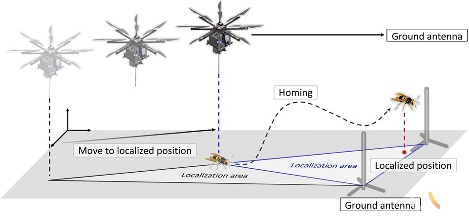 손형일 교수팀은 등검은말벌의 귀소본능에 착안해 등검은말벌에 초소형 센서를 부착한 후 안테나, 수신기, 추적 알고리즘이 내장된 제어기 등이 탑재된 무인항공기가 등검은말벌에서 나오는 센서 신호를 자율적으로 추적하여 등검은말벌 둥지를 찾아내는 시스템을 제안했다. (그림 1)