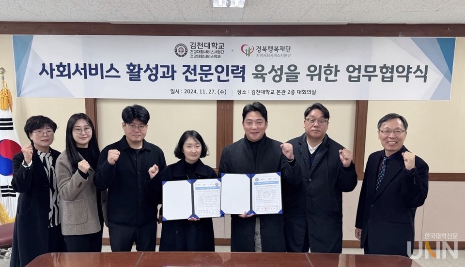 [한국대학신문 이정환 기자] 김천대학교(총장 윤옥현) 건강재활서비스사업단(단장 정우민)과 경북행복재단(대표이사 정재훈)이 평생직업교육체제 기반 마련을 통한 RISE 사업의 성공적 추진을 위한 업무협약(MOU)을 체결했다. 이번 협약은 지역과 산업, 대학 간의 연계와 동반성장을 통하여 새로운 경북, 미래 혁신을 위한 지역혁신중심 대학지원체계(RISE) 사업의 성공적 추진을 위한 협력체계 및 거버넌스 구축을 목적으로 추진됐다고 4일 밝혔다.