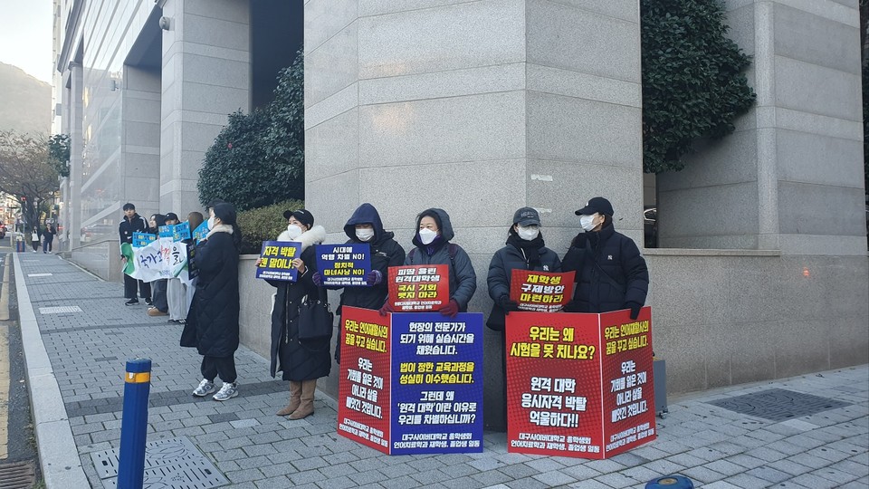 이날 시위는 서울, 부산, 대전, 대구 등 언어재활사 국가고시가 치러지는 시험장 앞에서 진행됐다. 대구사이버대 관계자들은 현재 원격대학 재학생과 졸업생들이 처한 상황을 알리는 한편 언어재활사 국가시험 자격 박탈에 대한 항의와 구제방안 마련을 촉구했다.