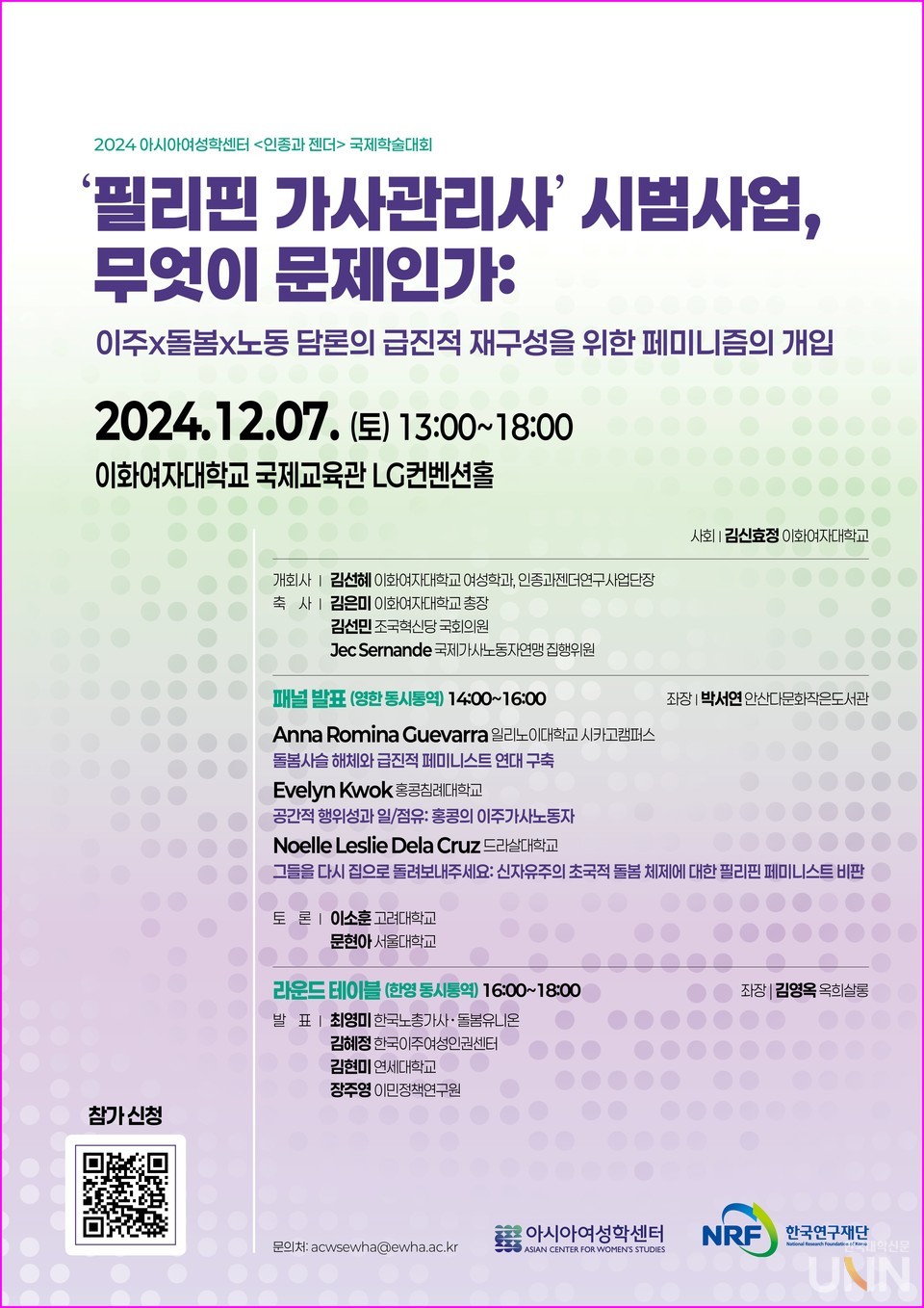 [한국대학신문 이정환 기자] 이화여자대학교 아시아여성학센터(소장 이은아)는 오는 7일(토) 오후 1시 국제교육관 LG컨벤션홀에서 ‘필리핀 가사관리사 시범사업, 무엇이 문제인가’를 주제로 국제학술대회를 개최한다.