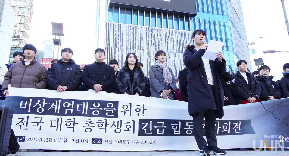 고려대, 서강대, 연세대, 이화여대, 한국외대, 지스트, 카이스트 등 7개 대학 총학생회가 모인 ‘한국대학총학생회공동포럼'은 6일 서울 신촌 스타광장에서 비상계엄 대응을 위한 전국 대학 총학생회 합동기자회견을 열고 각 대학 총학생회의 입장을 발표했다.