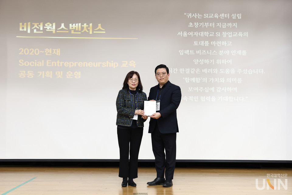 성과공유회에서는 SI교육의 시작과 현재, 미래를 담은 영상이 상영됐다. 영상은 ‘서울여대 건학이념이라는 수직의 맥’과 ‘다자간 협력이라는 수평의 맥’을 주제로 서울여대 SI교육의 방향성을 제시했다. 이어 센터와 지속적으로 협력해 온 비전웍스벤처스, 한국해비타트, 포스코이앤씨, 점프, 엔투비 등 주요 기관에는 감사패가 수여되며 협력의 의미를 되새기는 시간도 마련됐다.