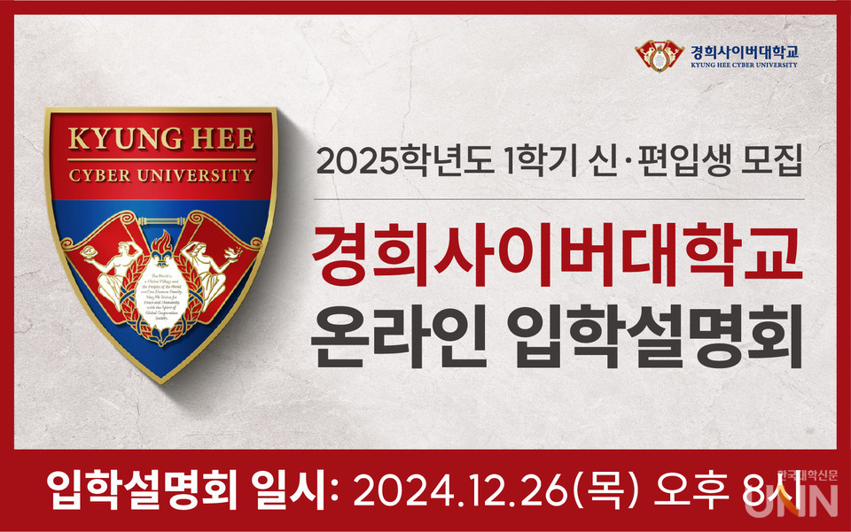 [한국대학신문 이정환 기자] 경희사이버대학교(총장 변창구)는 오는 26일(목) 오후 8시 2025학년도 1학기 온라인 입학설명회를 실시한다.