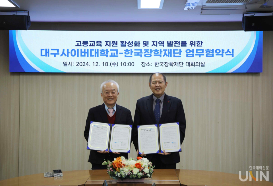 [한국대학신문 이정환 기자] 대구사이버대학교(총장 이근용)는 지난 18일 한국장학재단 대회의실에서 한국장학재단(이사장 배병일)과 고등교육 지원 활성화 및 지역발전을 위한 업무협약을 체결했다.
