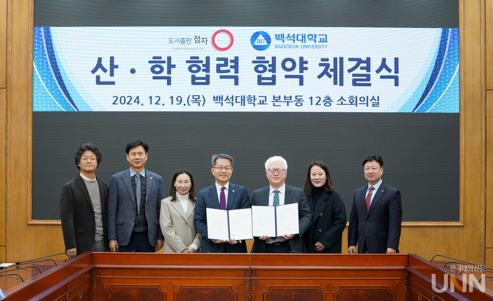 [한국대학신문 이정환 기자] 백석대학교(총장 장종현)는 19일 교내 본부동 12층 소회의실에서 ㈜도서출판점자(대표 김동복)와 산학협력 협약을 체결했다.