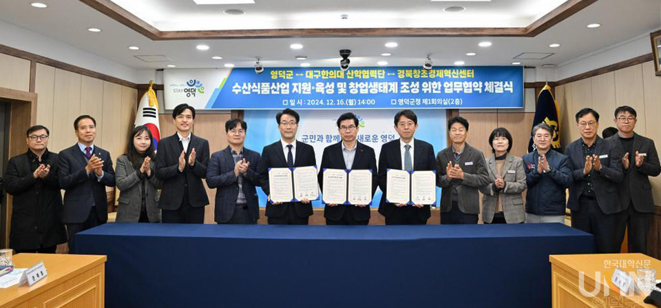 [한국대학신문 이정환 기자] 대구한의대학교(총장 변창훈) 산학협력단은 최근 영덕군과 경북창조경제혁신센터와 지역 수산식품산업 지원, 육성 및 영덕군 창업생태계 조성을 위한 업무 협약을 체결했다.