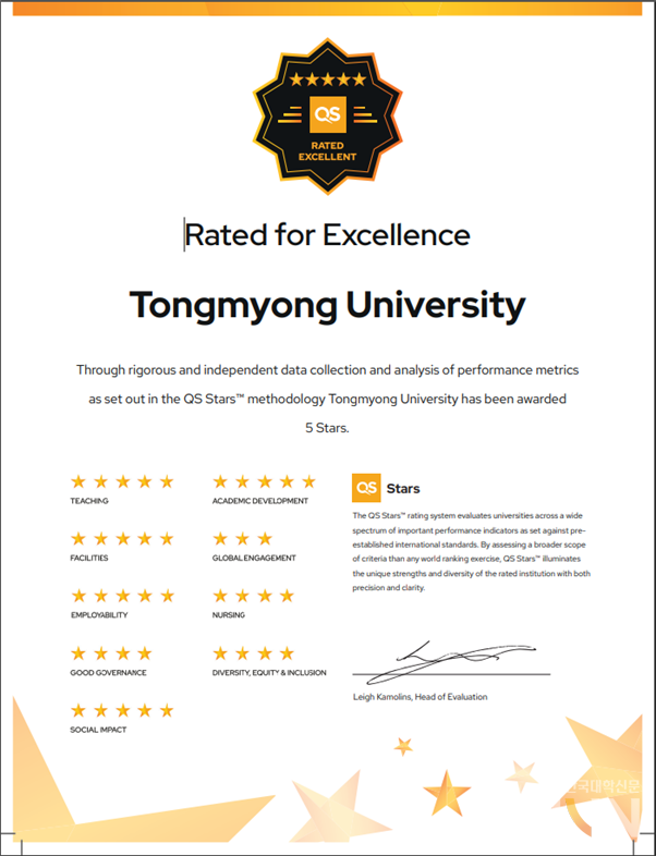 2024년 기준 전 세계 70개국 이상의 700개 대학이 QS 스타즈 평가를 받았으며, 그중 결과를 공개한 374개 대학 중 동명대가 국내 대학 가운데 유일하게 5성 인증을 받았다. QS 스타즈 대학평가에 처음 도전한 대학이 최상위 인증을 받은 건 놀라운 성과로 동명대의 지난 4년간 혁신 노력이 맺은 결과라는 평가다.