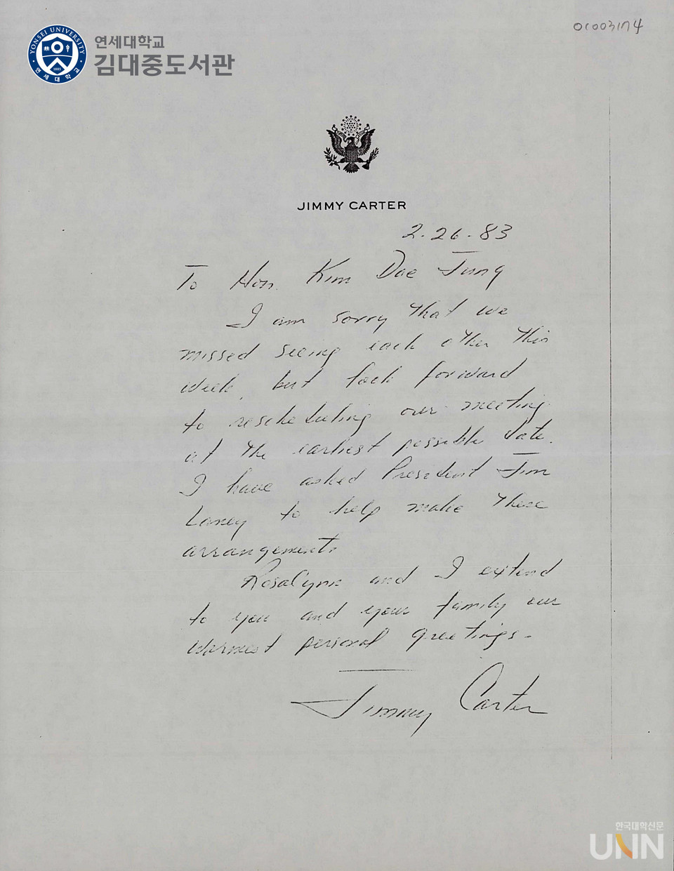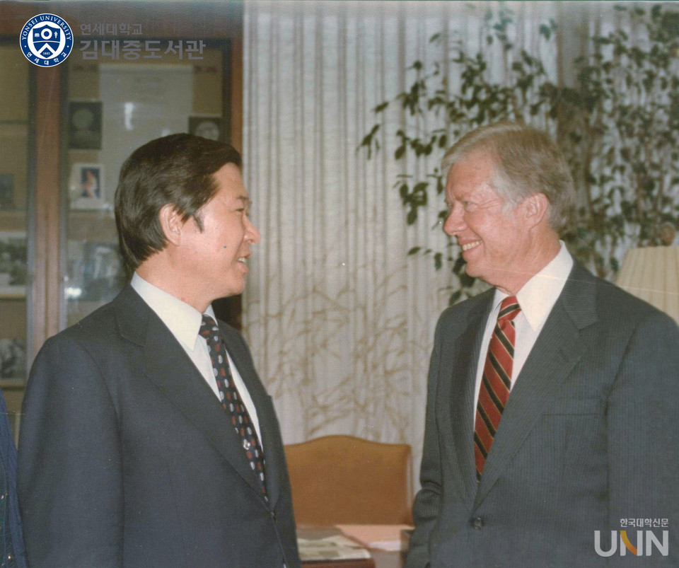 [한국대학신문 이정환 기자] 연세대학교 김대중도서관(관장 박명림)이 지난달 29일 서거한 지미 카터 전 미국 대통령과 김대중 전 대통령의 역사적 관계를 조명하는 사료를 공개했다. 이번에 공개된 사료는 김대중 대통령의 2차 미국 망명 시기(1982년 12월~1985년 2월)에 해당하는 자료로, 두 지도자가 민주주의와 인권, 평화를 위해 함께 노력했던 모습을 보여준다.