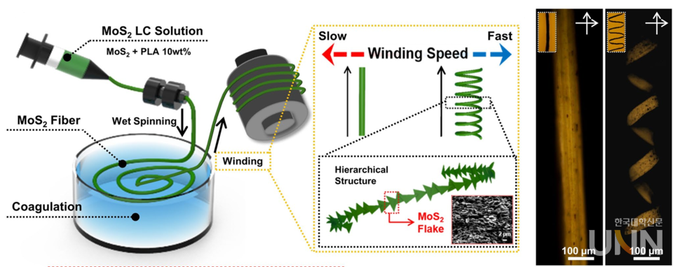 이번 연구에서는 이황화몰리브덴(이하 ‘MoS₂’)을 활용한 특수한 제작 공정을 통해 3차원 형태를 자유롭게 조절할 수 있는 섬유를 만들었다. 특히, 섬유를 리본 모양으로 뽑아내는 과정에서 자연스럽게 형성된 3차원 나선형 구조는 섬유의 곡선을 정밀하게 조정할 수 있게 해준다. 이렇게 제작된 섬유는 MoS₂가 가진 우수한 전기적·기계적 특성과 섬유 안의 정렬된 구조 덕분에 높은 성능을 발휘하며, 다양한 환경 정보를 감지할 수 있는 잠재력을 보여줬다.