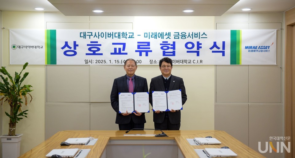 [한국대학신문 이정환 기자] 대구사이버대학교(총장 이근용)는 지난 15일 대학 본관 C.I.R 회의실에서 미래에셋 금융서비스(대표이사 김평규)와 교육 및 금융 분야의 동반성장을 도모하고, 사회적 가치를 실현하기 위한 협약을 체결했다.