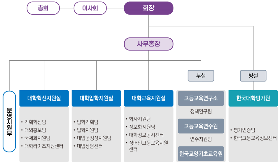 또한 대교협은 ‘대학교육정보실’을 ‘대학교육지원실’로 확장·개편하며, 대학교육지원 업무를 통합적으로 수행한다. 새롭게 개편된 대학교육지원실에는 기존 정보화지원팀과 대학정보공시센터 를 포함해 △학사지원팀 △장애인고등교육지원센터가 소속되며 위탁사업의 전문성을 바탕으로 대학 교육의 질적 향상을 지원한다.