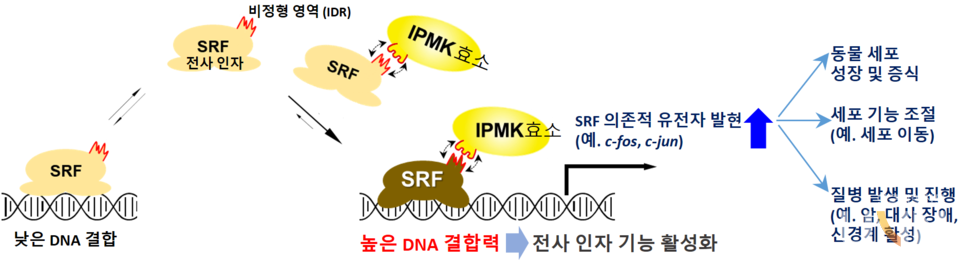 연구팀은 IPMK 효소에 의해 활성화된 SRF 전사 인자를 통해 다양한 유전자들의 전사 과정이 촉진된다는 것을 밝혔다. 즉, IPMK 단백질은 SRF 전사 인자의 단백질 활성을 높이는 데 반드시 필요한 조절 스위치와 같은 역할을 수행하는 것임을 연구팀은 규명했다.