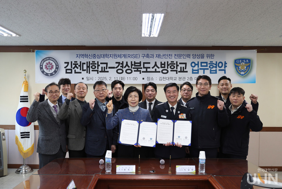 [한국대학신문 이정환 기자] 김천대학교(총장 윤옥현)와 경상북도소방학교(학교장 이상무)는 지역 혁신 중심대학 지원체계(RISE) 구축과 재난안전 전문 인력 양성을 위한 업무협약을 체결했다고 12일 밝혔다. 이번 협약을 통해 양 기관은 재난안전분야의 전문인재양성과 지역사회 안전 강화를 위한 협력을 본격화할 예정이다.