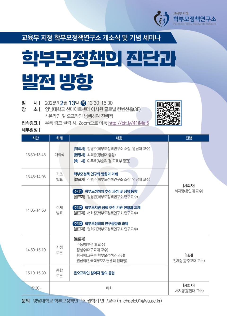 이날 행사에서는 개소식 함께 ‘학부모정책의 진단과 발전 방향’을 주제로 기념 토론회가 진행된다. 토론회에서는 김병주 소장의 개회사과 최외출 영남대 총장의 환영사, 이주호 부총리 겸 교육부 장관의 축사를 시작으로 △학부모정책 연구의 방향과 과제(김병주 소장)의 기조발표, △학부모 정책의 추진 과정 및 최신 동향(김경원 학부모정책연구소 연구교수) △학부모지원 정책 추진 기관 현황과 과제(서화정 학부모정책연구소 연구교수) △학부모정책의 연구동향과 과제(권혁기 학부모정책연구소 연구교수)의 발제가 이어진다. 발제한 후에는 현장 지정토론과 온라인(ZOOM) 자유 질의응답이 진행될 예정이다.