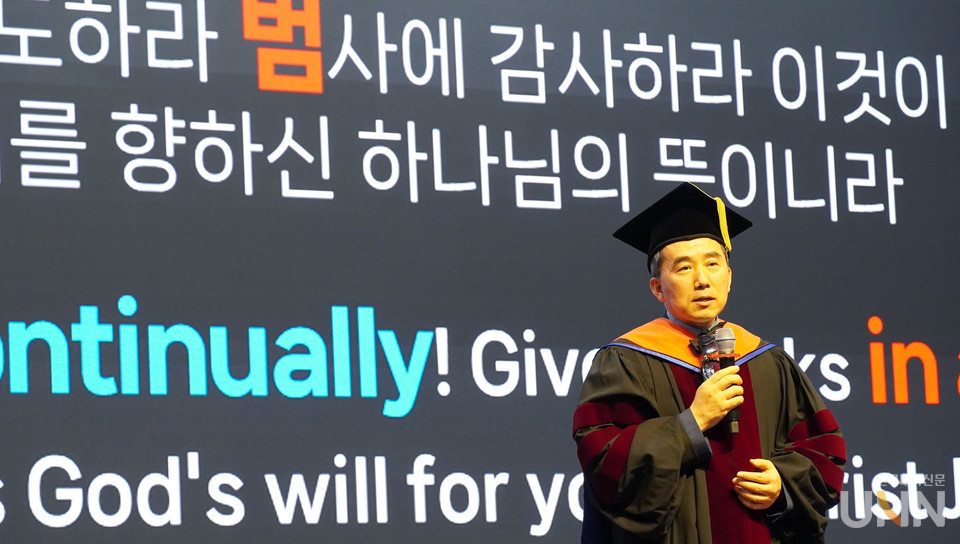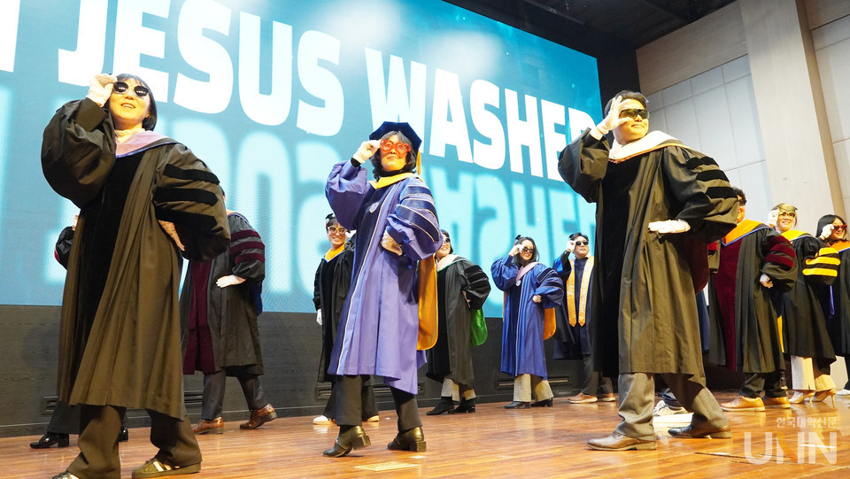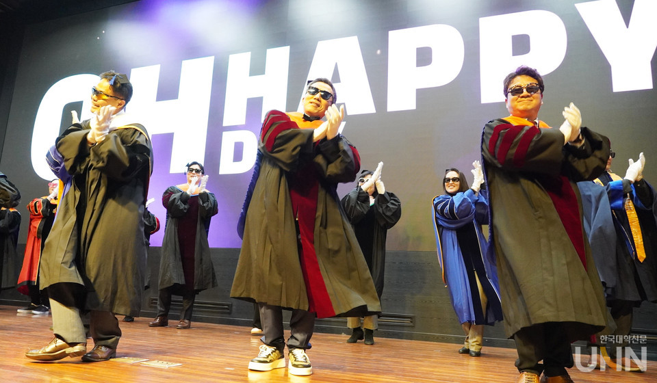 머리에 미니 학사모 핀을 꽂고 파티 썬그라스를 쓴 박 총장과 교수들의 'Oh Happy Day' 노래와 율동에 객석의 졸업생들도 손뼉치며 환호했다. 교수들은 무대 아래로 내려가 객석 졸업생들 앞에서 노래와 율동을 하고 다시 무대로 올라와 마무리 공연을 했다.