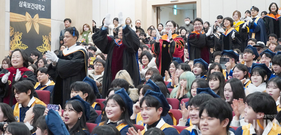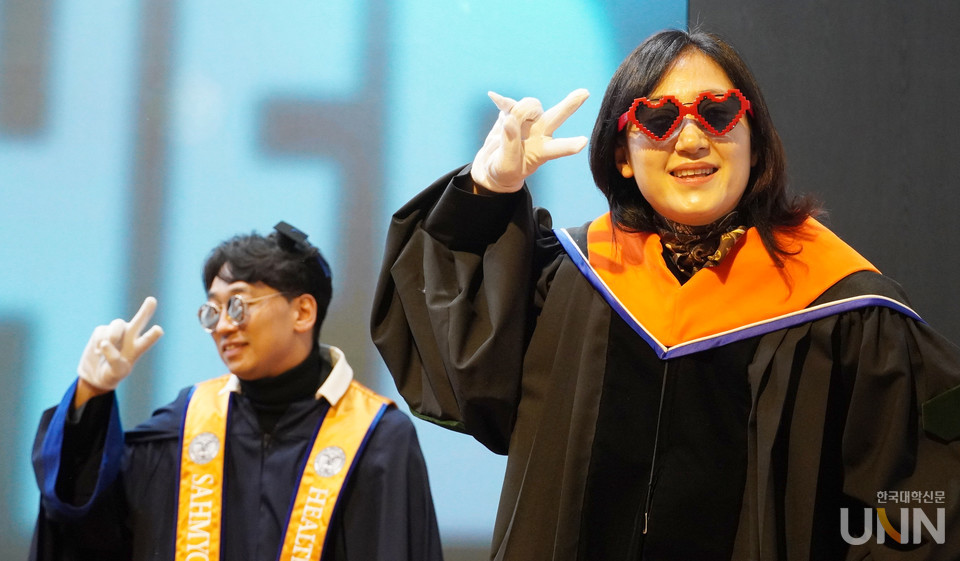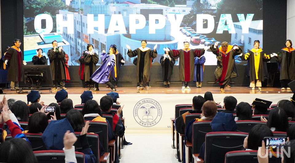 삼육보건대학교 학위수여식이 열린 12일 교내 대강당은 일순간 공연장이 됐다. 박주희 총장과 김예진 부총장을 비롯해 20여 명의 교수들이 학위수여식 마지막 순서에 '교수 공연'을 했다.