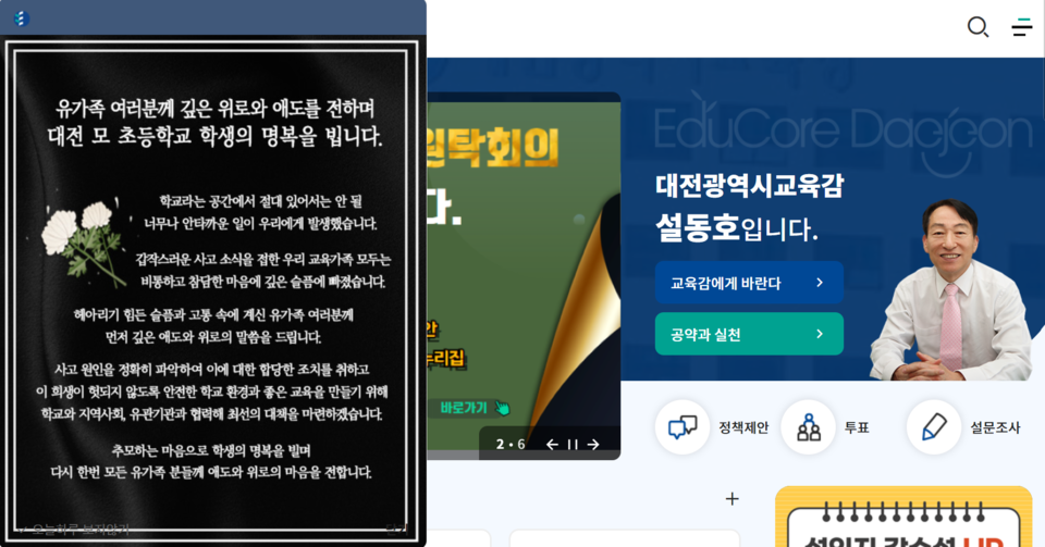 대전교육청은 고인의 명복과 유가족에게 위로를 전하며, 더 이상 온라인 커뮤니티나 사회관계망서비스(SNS) 등에 유가족을 향한 무분별한 명예훼손 및 선 넘는 비방글 등 악성 댓글을 자제해주길 강력히 호소했다.