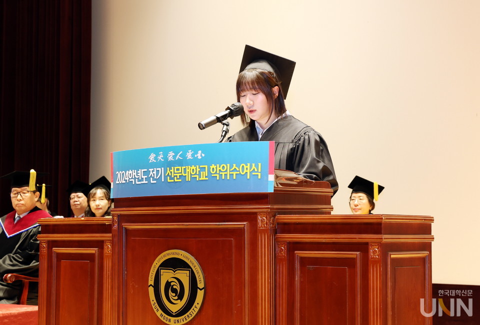 문성제 총장은 졸업식사를 통해 “‘글로컬 서번트 리더’로서 대학에서 배운 지식과 이성을 가지고 사회적 리더로 성장하길 기대한다”면서 “세상의 주인은 나 자신임을 잊지 말고, 선문인으로서 자긍심을 가지고 변화를 주도하는 우리 사회의 주역이 되어주길 당부한다”고 말했다. 이어 “선문대가 항상 여러분과 함께하겠다”고 졸업생을 응원했다.