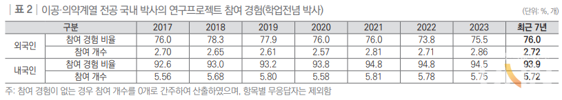 보고서에 따르면 이공·의약계열 전공 외국인 박사의 장학금 비중은 줄고, 내국인 박사에 비해 연구프로젝트 참여는 적은 것으로 나타났다. 이공·의약계열 외국인 박사의 학비에서 장학금이 차지하는 비율은 2017년 83.1%에서 2023년 71.2%로 감소했으나, 같은 기간 자부담(본인부담 혹은 가족지원) 비율은 13.2%에서 2023년 24.4%로 증가했다. 이공·의약계열 학업전념 외국인 박사의 연구프로젝트 참여 경험은 최근 7년 평균 76.0%(2.72개)로 동일 계열 학업전념 내국인 박사 93.9%(5.72개)보다 낮았다.