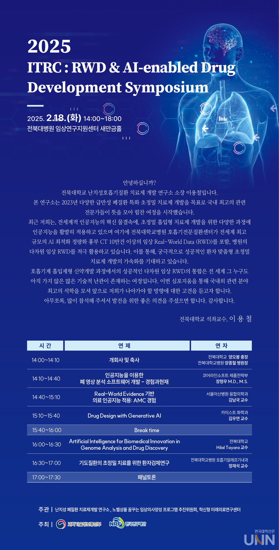 연구소의 이용철 소장은 “AI는 신약 개발과 정밀 치료에서 필수적인 기술로 자리 잡았으며, 특히 폐암과 난치성 호흡기 질환의 치료제 개발에 있어서 AI의 활용이 확대되고 있다”고 말했다. 그는 또한 “전북대병원이 구축한 10년 이상의 장기 입원 환자 데이터를 포함한 다차원 RWD를 활용하여, 초정밀 맞춤 치료제 개발에 박차를 가하고 있다”며 “이번 심포지엄은 국내외 연구진과 협력하여 정밀의료의 미래 방향을 모색하는 계기가 될 것”이라고 덧붙였다.