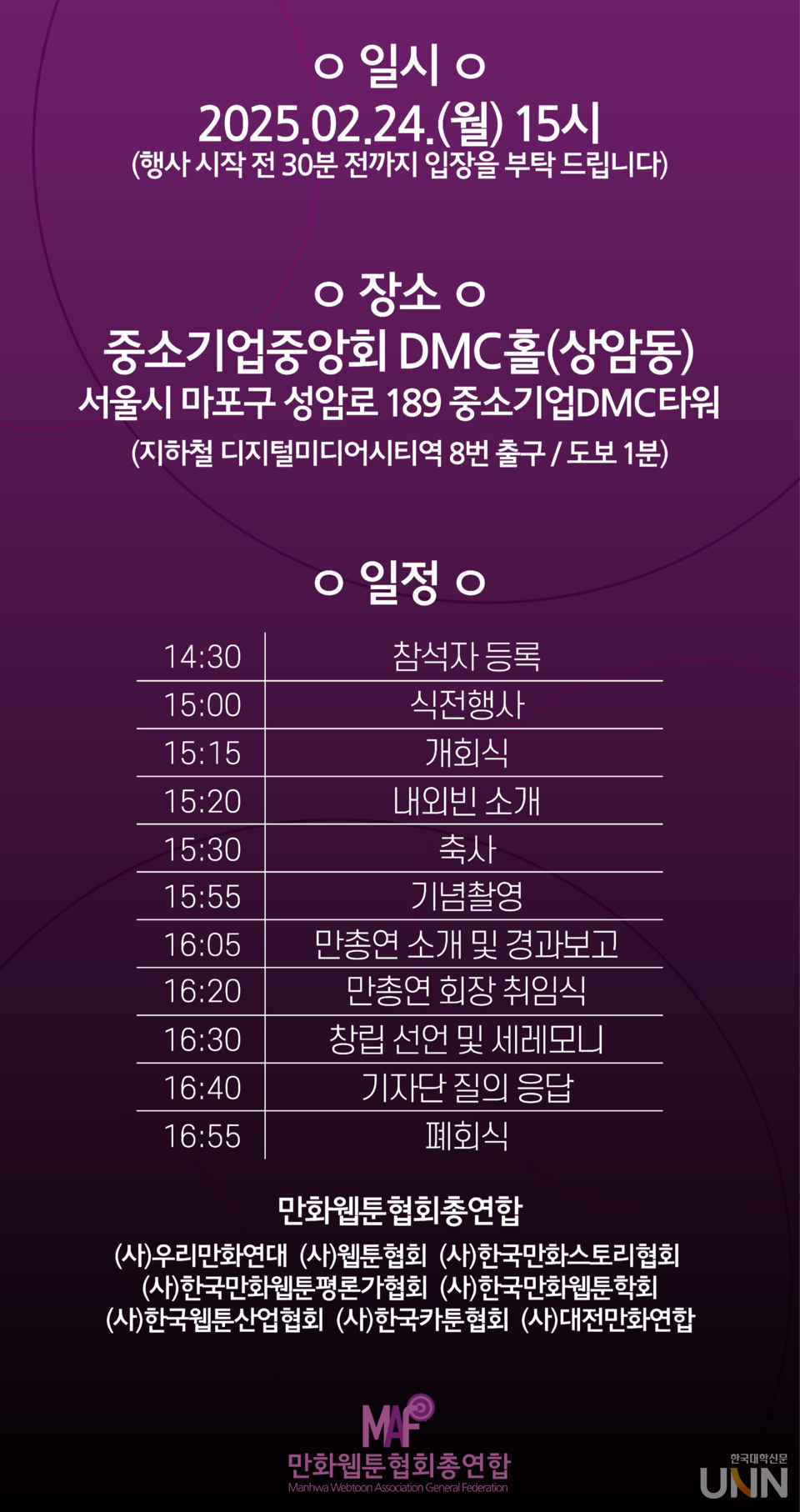 17일 만화계에 따르면 24일 서울 상암 중소기업 DMC타워에서 만화웹툰협회총연합(MAF) 발대식이 개최된다. 행사에서는 창립 선언문 발표, 주요 정책 제안, 민관 협력 방안 논의, 네트워킹 등이 진행된다.