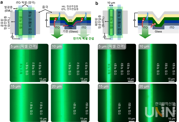 이에 연구팀은 10,000 ppi 이상의 초미세패턴이 가능한 유기반도체 정공전달소재를 개발해 고밀도 픽셀 환경에서도 신호 간섭 없이 고해상도 OLED 소자를 성공적으로 구현했다. 연구진은 실리콘(Si) 반도체의 비등방성 식각 기반 포토리소그래피 공정을 활용해 실리콘(silicone) 분자를 도입한 가교형 정공전달층을 대면적 웨이퍼(6인치)에서도 마이크로미터 수준의 정밀한 초고해상도 픽셀을 구현할 수 있는 기술을 개발했다. 이 기술을 바탕으로 고해상도 OLED 픽셀 어레이에서 전기적 신호 간섭으로 인한 근접 픽셀 발광현상이 억제됨을 증명했다. 더 나아가 실리콘 분자의 도입을 통해 유기반도체 기반 정공전달층의 에너지 레벨과 정공 전달 속도를 제어함으로써 OLED의 발광효율을 향상시킬 수 있었다.